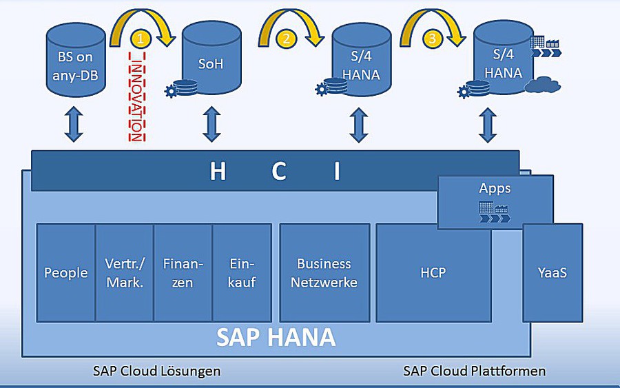 Prozesse werden zukünftig hybrid von on-premise Systemen und Cloud Lösungen unterstützt und system- und lokationsübergreifend integriert sein. Für SAP Bestandskunden werden die neuen technologischen und prozessuralen Möglichkeiten insbesondere nutzbar, sobald der erste Migrationsschritt ihrer Business Suite Anwendungen auf SAP HANA (Suite on HANA) erfolgt ist.